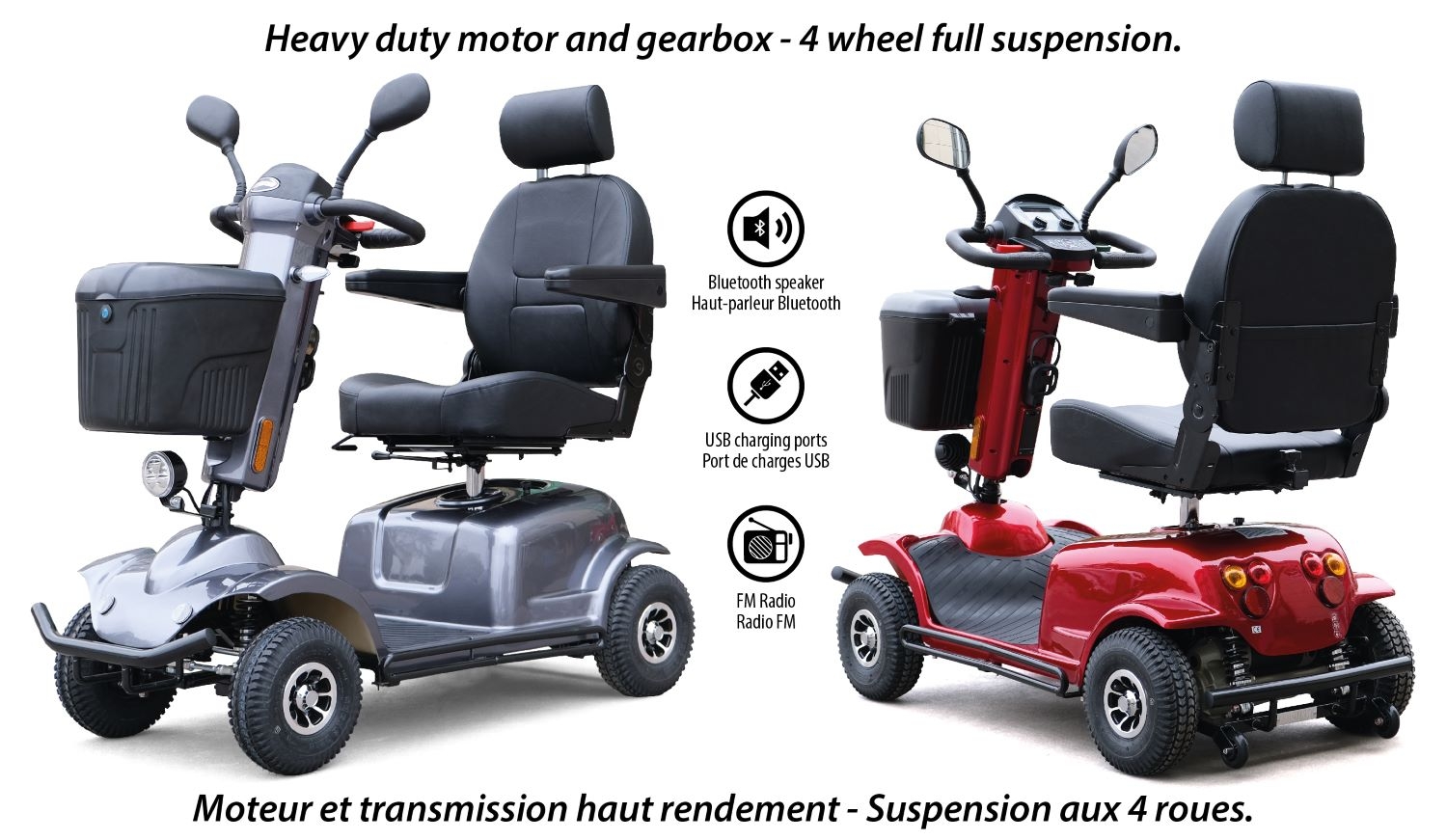 Orthoquad is proud to introduce its RZ500 scooter. This brand new model was designed to provide an unbeatable equipment / price ratio. Powered by a reliable and powerful 450 watt motor and paired with two 40 amp batteries, it can reach up to 12 km/h with an impressive range. With its active four-wheel suspension, the RZ500 offers a high level of comfort even on rough terrain.