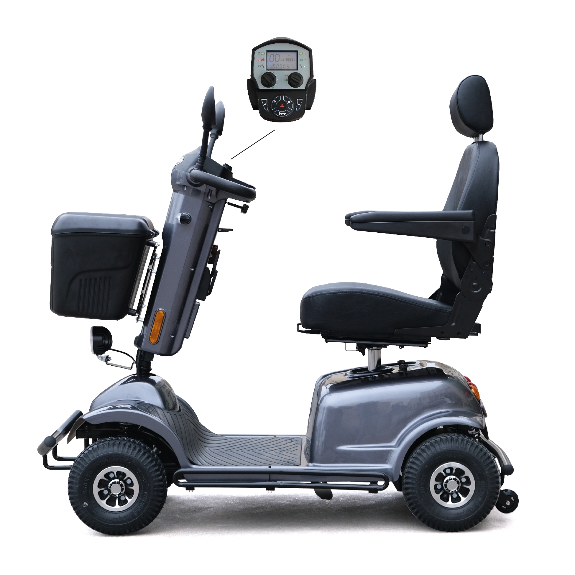 It has a long list of standard luxury features: High-power front LED headlight for maximum brightness with minimum maintenance, a comfortable high-back fully adjustable seat with headrest and armrests also adjustable, a lockable front basket, a cup holder, two mirrors, and solid steel made front, rear and side bumpers for maximum safety. You will also enjoy its FM radio with bluetooth speaker and its USB ports allowing you to charge small electronic devices like your mobile phone.